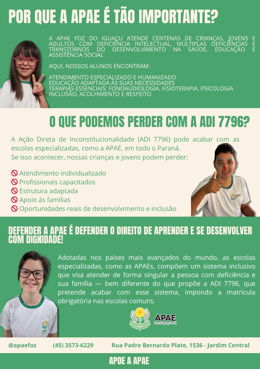 É importante ressaltar que, somente no Paraná, as APAEs mantêm 343 escolas especializadas, atendendo a mais de 40 mil pessoas com deficiência intelectual e múltipla. Essas entidades prestam um "serviço educacional de excelência", com equipes multiprofissionais, infraestrutura adequada e comprovados resultados na promoção da autonomia, inclusão e qualidade de vida das pessoas com deficiência.