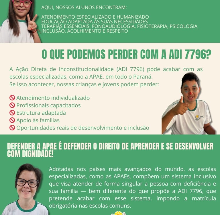 Hoje trazemos à tona um tema de extrema importância para o futuro da educação de pessoas com deficiência em nosso estado do Paraná, que está sendo debatido na mais alta instância judicial do país, o Supremo Tribunal Federal (STF). Trata-se da Ação Direta de Inconstitucionalidade (ADI) nº 7796. Esta ação, ajuizada por uma federação de associações de Síndrome de Down, está gerando grande preocupação e motivou manifestações de repúdio de importantes segmentos da sociedade civil e governamental.