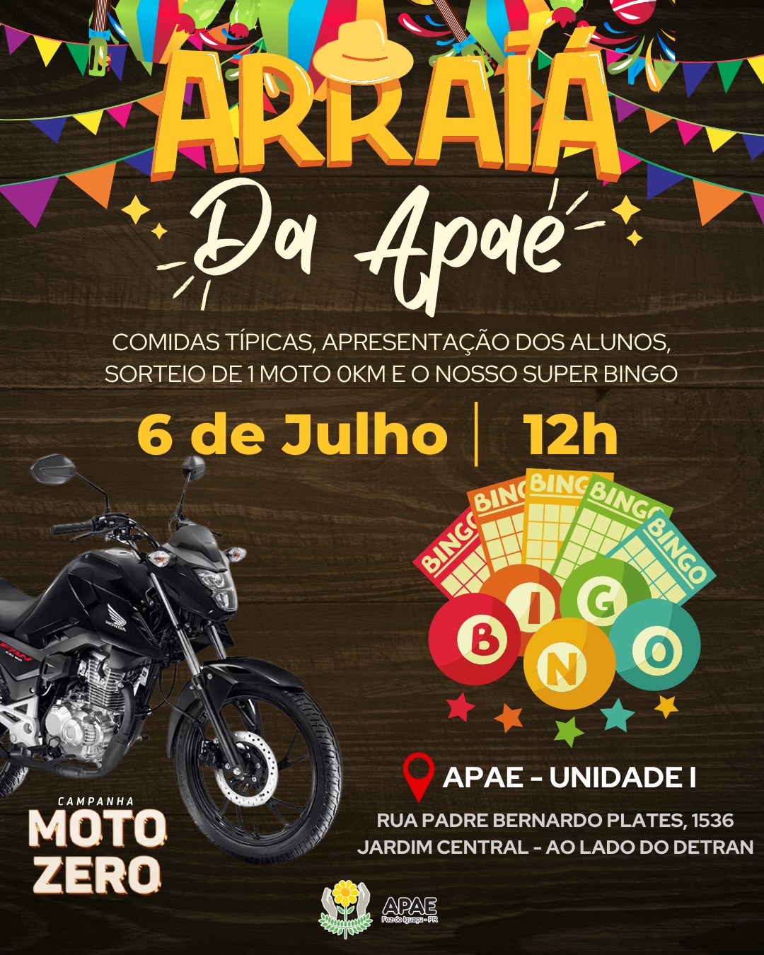 No dia 06/07, a partir das 12h, vai acontecer a nossa imperdível Festa Junina da APAE, cheia de alegria, diversão e solidariedade!